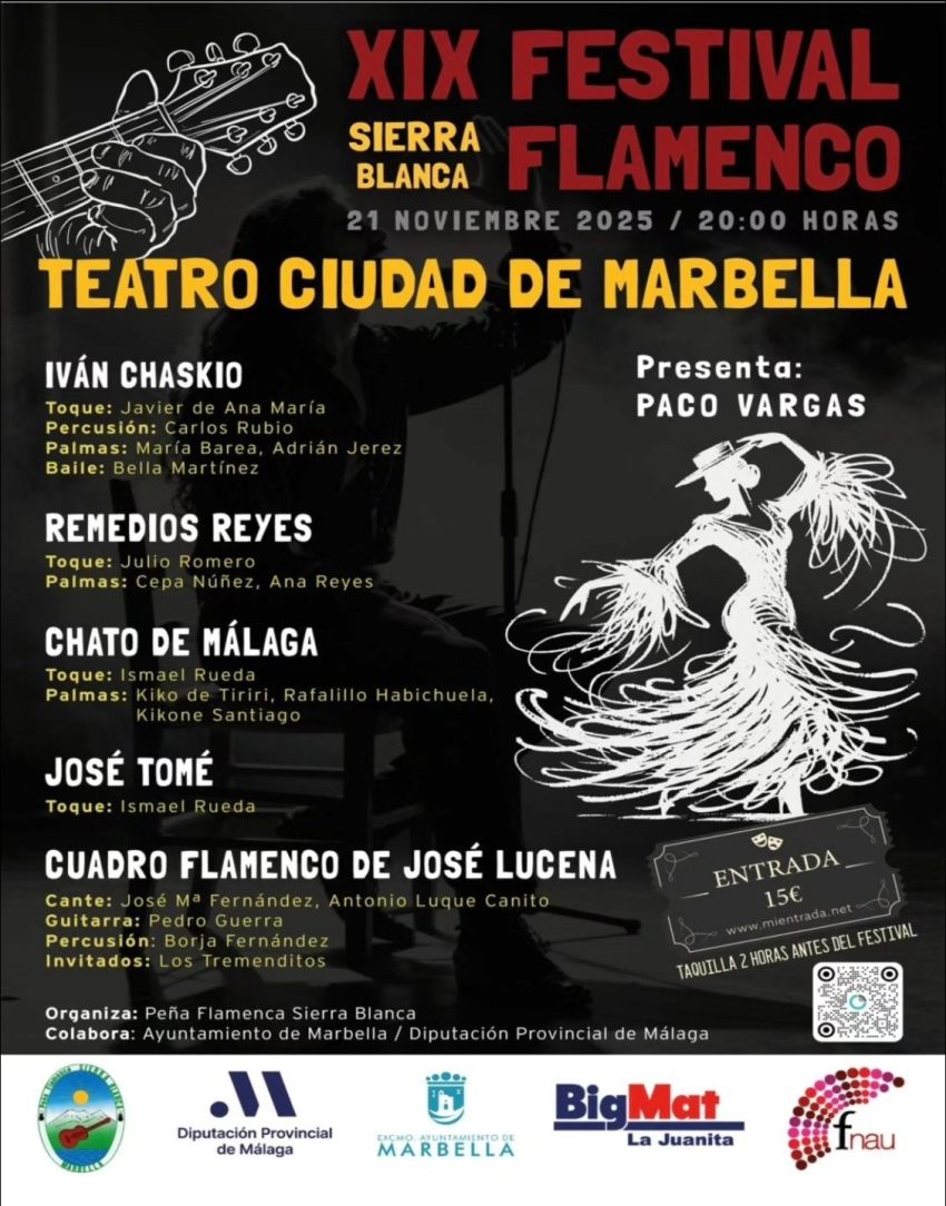 El Teatro Ciudad de Marbella acogerá el viernes 21 de noviembre, a las 20:00 horas, la décimo novena edición del Festival Sierra Blanca Flamenco, organizado por la Peña Flamenca Sierra Blanca. El acto será presentado por Paco Vargas.