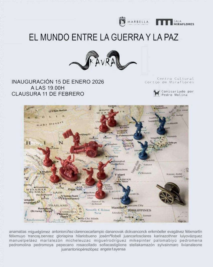 El Colectivo La Kavra inaugura el próximo jueves 15 de enero, a las 19.00 horas en el Cortijo Miraflores, la muestra «El mundo entre la guerra y la paz» que reúne a 35 artistas internacionales en un diálogo visual sobre el conflicto, la resistencia y la libertad de expresión.